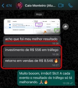 Todas as suas dúvidas respondidas de forma rápida diretamente por mim no Whatsapp. É praticamente uma mentoria individual pelo preço de um curso online com desconto astronômico. Esse sem dúvidas é o melhor suporte de um curso online sobre marketing para lotar eventos que existe no Brasil.