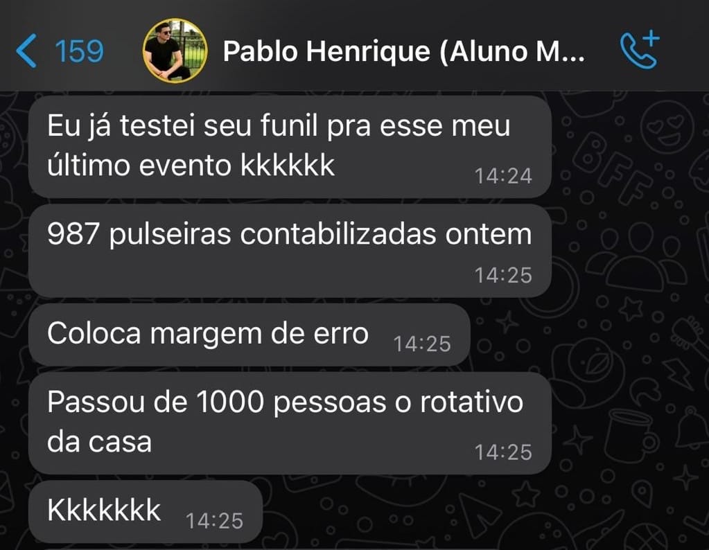 O Pablo Henrique tem uma boate (casa de festas) e estava com dificuldade em escalar as vendas de ingressos dos seus eventos. Quando entrou no Método descobriu que não tinha uma estratégia de marketing validada por trás suas festas. No seu primeiro evento explorando o funil de anúncios online que aprendeu no treinamento vendeu mais de 980 ingressos antecipados e chegou à super lotação da casa.