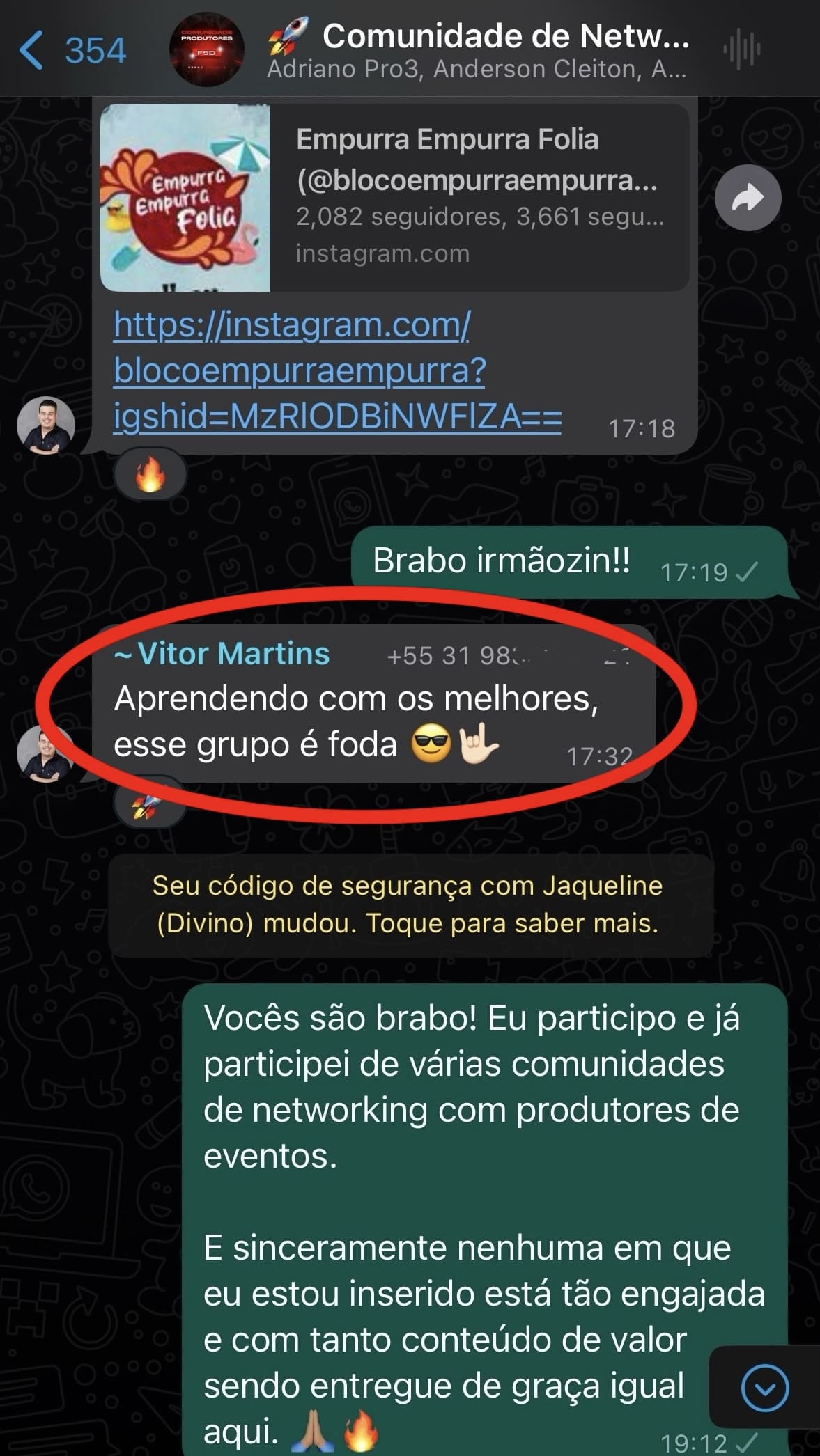 Todas as suas dúvidas respondidas de forma rápida diretamente por mim no Whatsapp. É praticamente uma mentoria individual pelo preço de um curso online com desconto astronômico. Esse sem dúvidas é o melhor suporte de um curso online sobre marketing digital para lotar eventos que existe no Brasil.