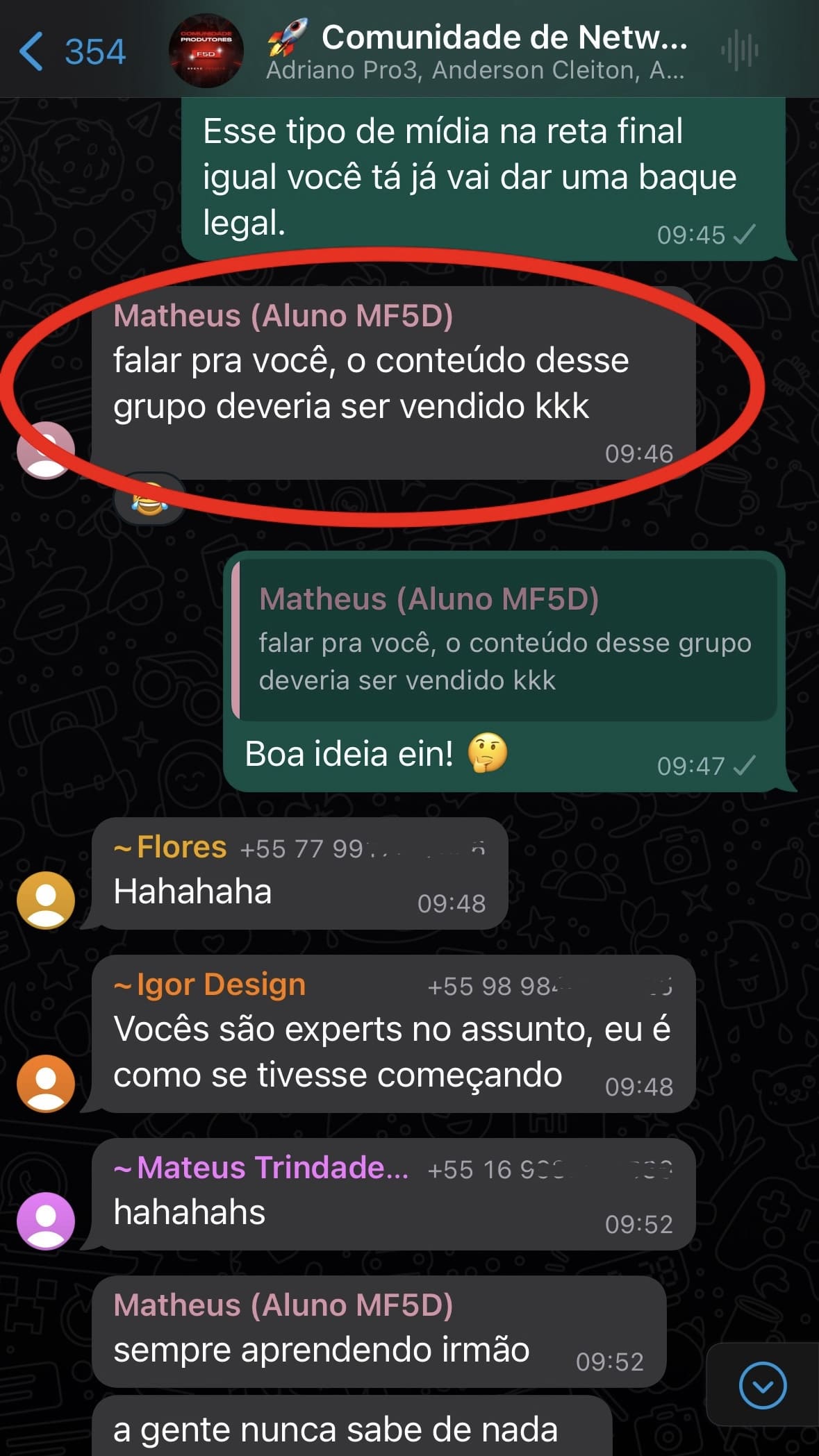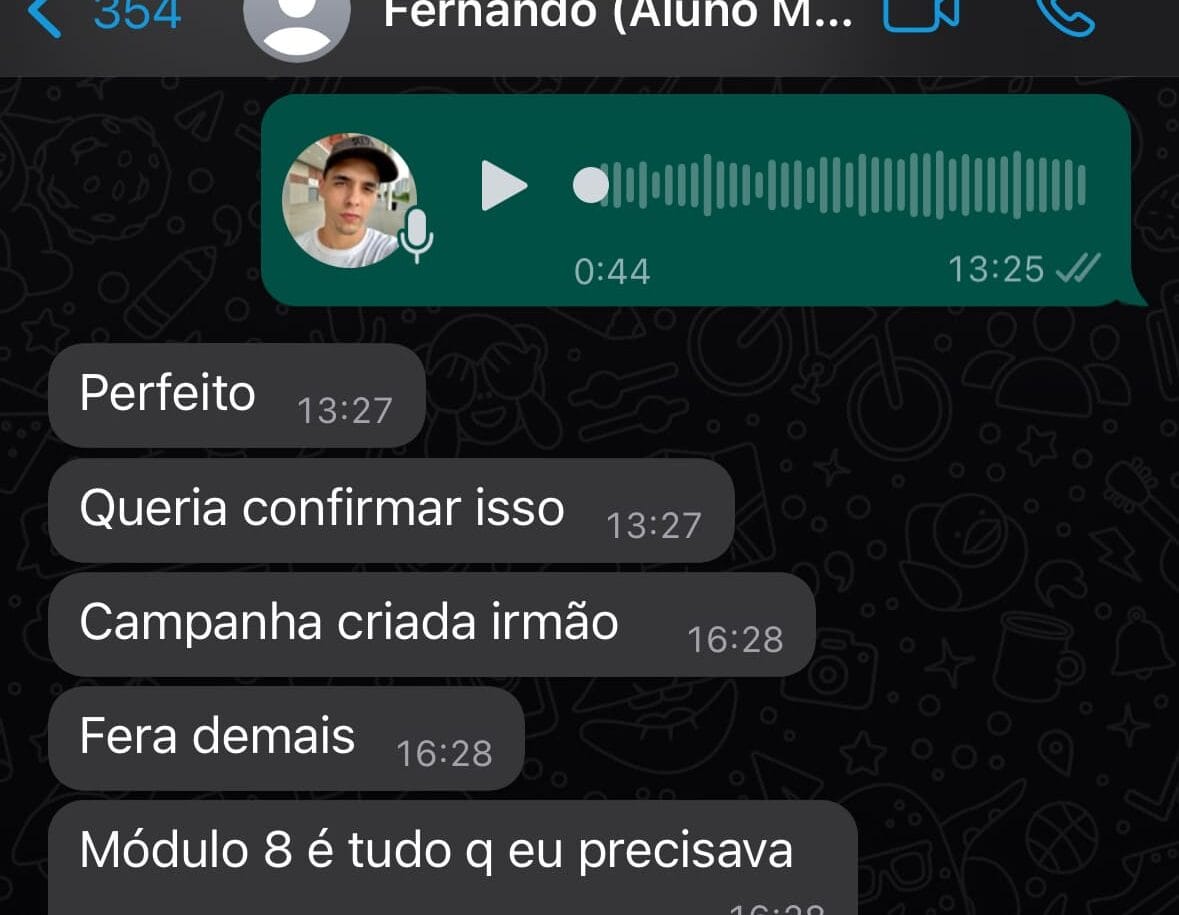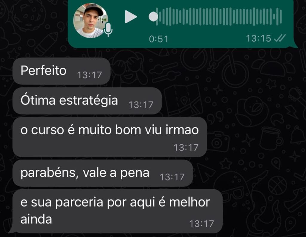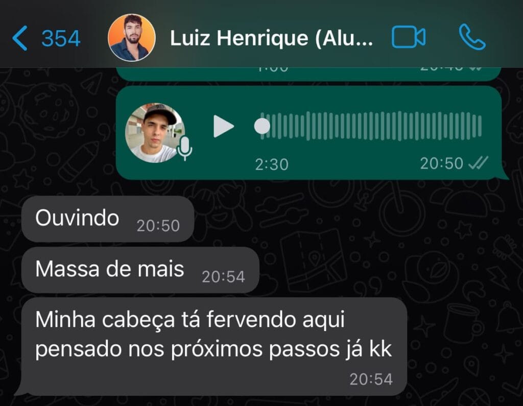 O Luiz Henrique é gestor de tráfego para eventos iniciante e estava cometendo erros básicos pela falta de estratégias com os funis de vendas online. Depois de estudar as aulas sobre funil de anúncios do MF5D, ele já percebeu que precisava mudar muitas coisas nas campanhas dos seus clientes. Ele disse que explodiu a mente com as soluções práticas que dei pras necessidades específicas do evento dele pelo Whatsapp.